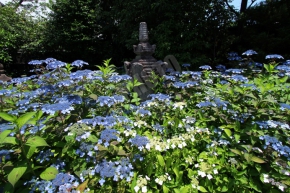 本堂に入る入口では、お地蔵さんと甘茶の花が